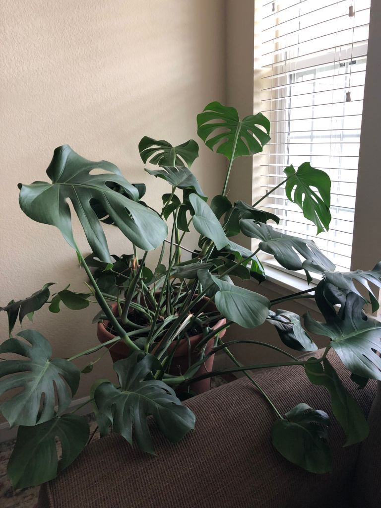 MONSTERA DELICIOSA- this is my all time favorite plant. i’ve sold cuttings off this plant, moved it, etc., and it continues to thrive. i do one weekly watering (2 cups since it’s so large) and every week during the spring/summer, it truly sprouts 1-2 leaves! and it’s just so beautiful! this pic was taken shortly after 6 leaves were cut off to propagate.
