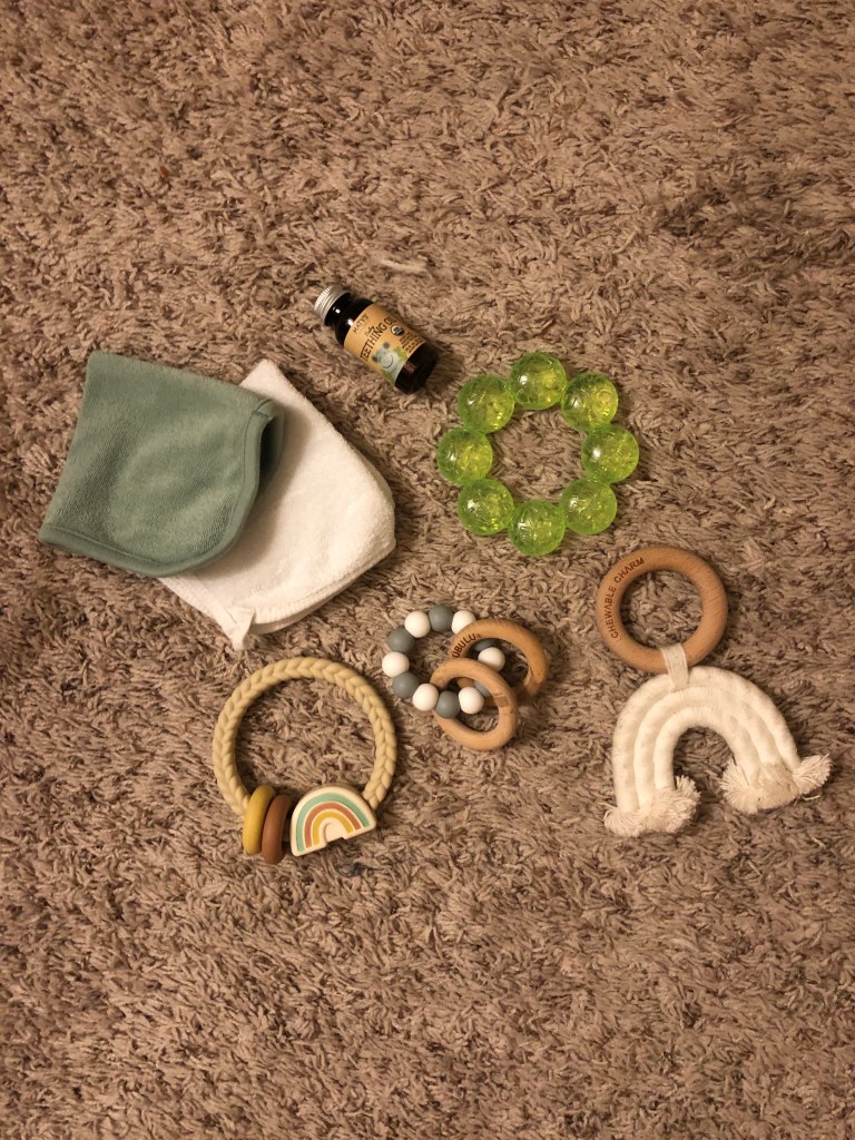 my poor guy is teething so some days are pretty hard. we are not using medication but soothing his gums naturally with organic oil and things to chew on. i sent with a ring they can freeze; he loves the one we have in our freezer. i also packed two wash cloths because this helps his teeth too when they’re wet with cold water. he’s started grabbing at things more, so he loved the teething toys he can hold and put in his mouth by himself.