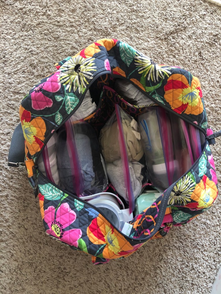 yes- the bag is pink with flowers… i added to his christmas list i started this past week, an overnight bag that’s a bit less feminine. at least at his age, he doesn’t seem to care ;). i put all his stuff into ziplock baggies, labeled with the correct category so that everything would be easy to navigate and find for my parents.