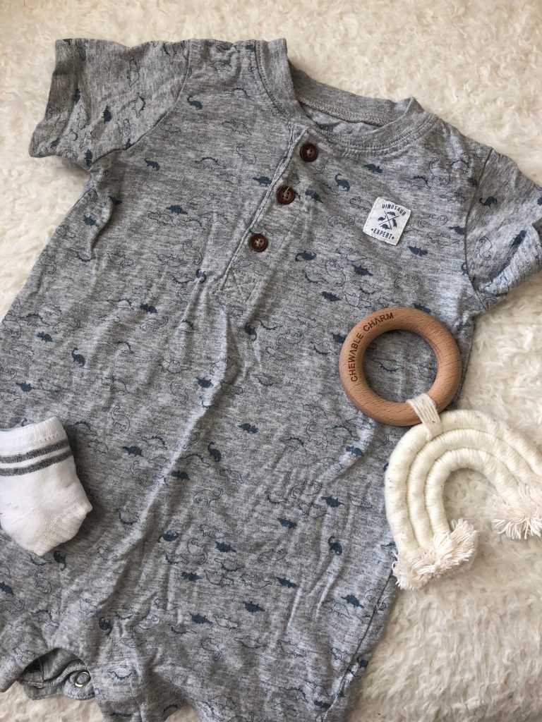 my next category are items directly for my son. i have an extra outfit, a pair of socks, and a toy/teether. i typically keep a couple teethers since he’s currently teething, but this is one that has stayed in there. i like to keep an outfit that’s not my favorite one because i rarely have to use it. i also check the sizing on it about every month to make sure it actually still fits him since he’s growing so quickly. it wouldn’t do me any good to have an outfit for him if it doesn’t fit. i do keep extra diapers, wipes, and a couple spare outfits in the car as well just in case.