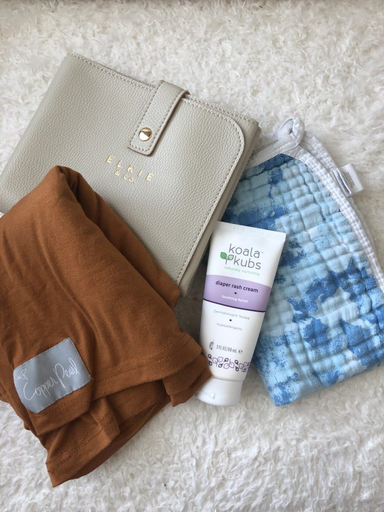 the next categories are for feeding & changing. i exclusively breast feed my son, so i don’t need many items. but, i have a nursing cover in case i’m in public. i also have a portable changing mat that folds up super nicely. i have a burp cloth (this gets used often) and some diaper rash cream; i have yet to use it but want to include just in case. and of course, i have wipes and diapers. i tend to keep about 8 diapers in there to be certain i wouldn’t run out of i were out of the house for the majority of a given day.