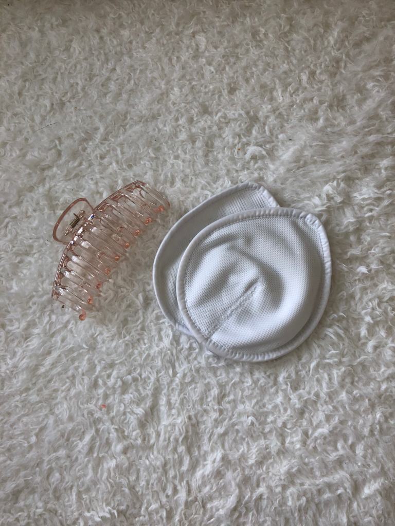 i separated everything in here into categories based on what it’s used for. first category are the mama necessities- just two things. i have a claw clip for my hair; sometimes you get super warm while nursing and need your hair up. the second thing is a pair of reusable pads. i needed these more at the beginning of breast feeding, but i want to always have a pair on hand just in case.