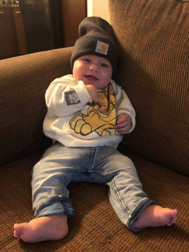 - sweatshirt & jeans. every baby looks adorable in jeans, am i right?! the nice thing about jeans (or jeggings) is that the outfit ideas are endless because pretty much everything can match with jeans. in this pic, hudson was wearing a lion king sweatshirt from zara and a carhartt beanie.