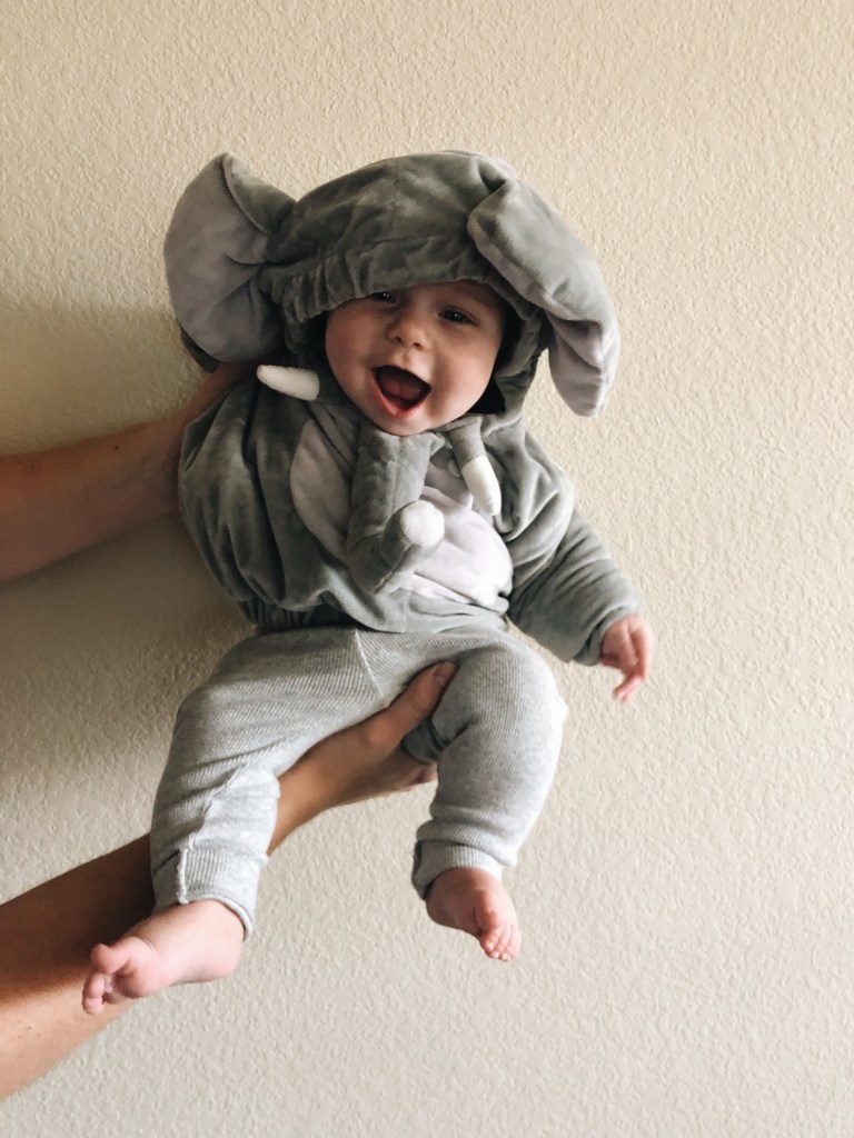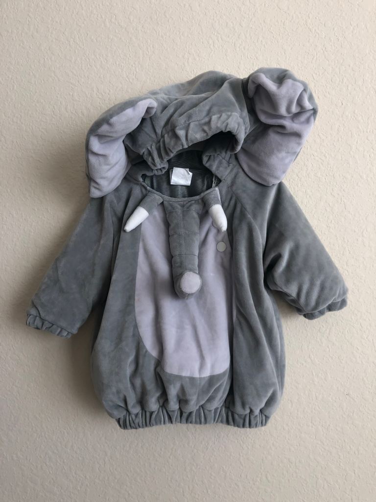 next is the whole reason i went baby thrifting in the first place- a costume. our family did not have plans for halloween, but i still wanted hudson to get a picture in a costume. i found this cute elephant costume for $5.50. the bottom actually doesn’t have any leg holes or anything which makes it convenient for sizing too!