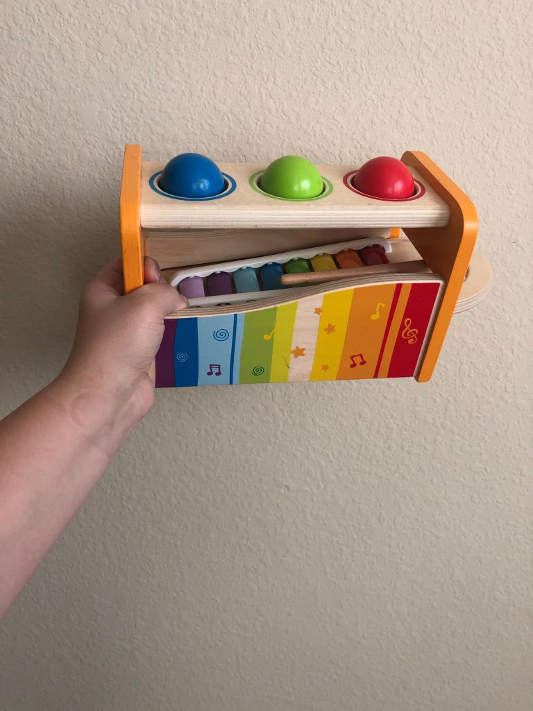 the next item is a wooden toy for $5.50. i am a sucker for a good, wooden toy. this is a two-in-one toy- an xylophone that you can pull out the side and a ball set where you match the ball to the colored ring and use the little wooden hammer to knock it in.