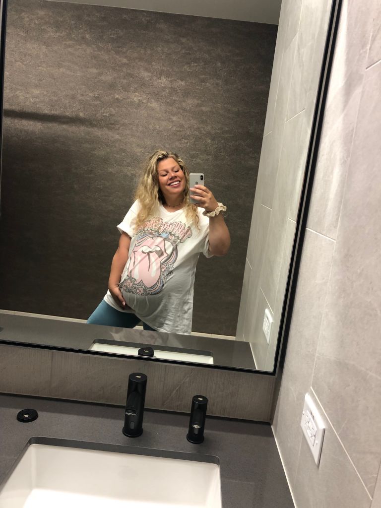 i have a love hate relationship with maternity clothes. i only really buy maternity pants and just wear oversized tops as i grow bigger. thankfully my husband is a foot taller than me and his shirts are perfect maternity shirts. but, last month i found the most perfect oversized graphic tee at target!!! like, it’s actually oversized in length and not just width. here’s a pic of it!