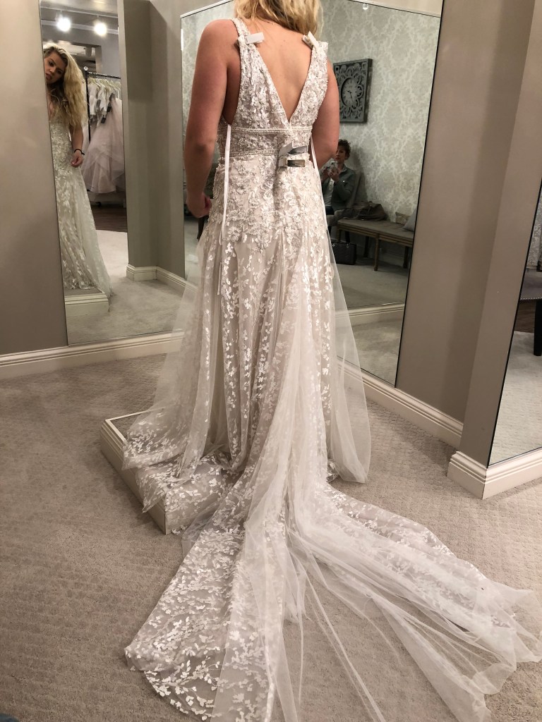 this last one is probably one of my least favorites of all the dresses but definitely fits the style i originally thought i would go for. i didn’t love the bulky, high neck line and the darker undertones. also, the train’s shape was not my favorite, but i did love the low back.