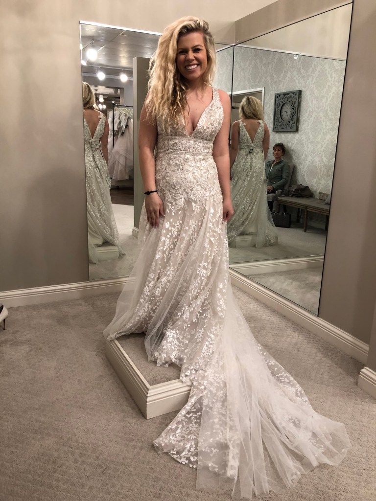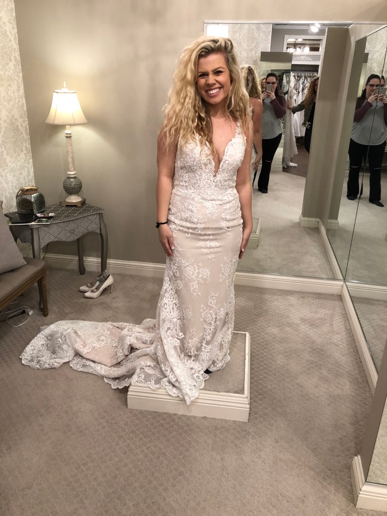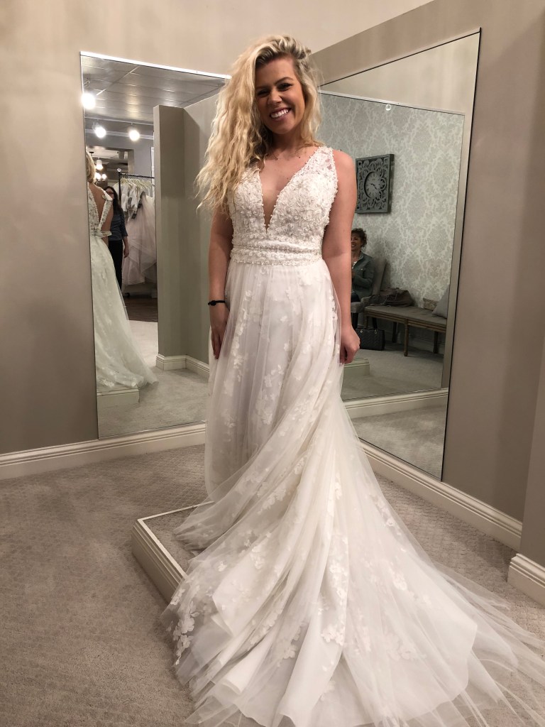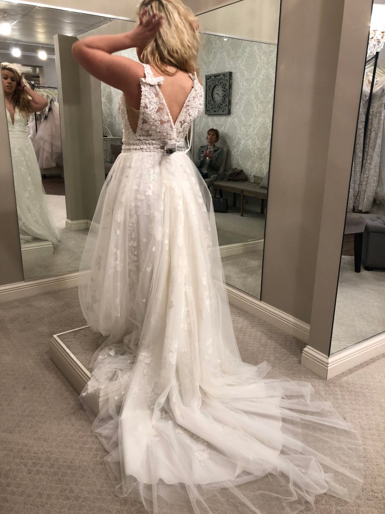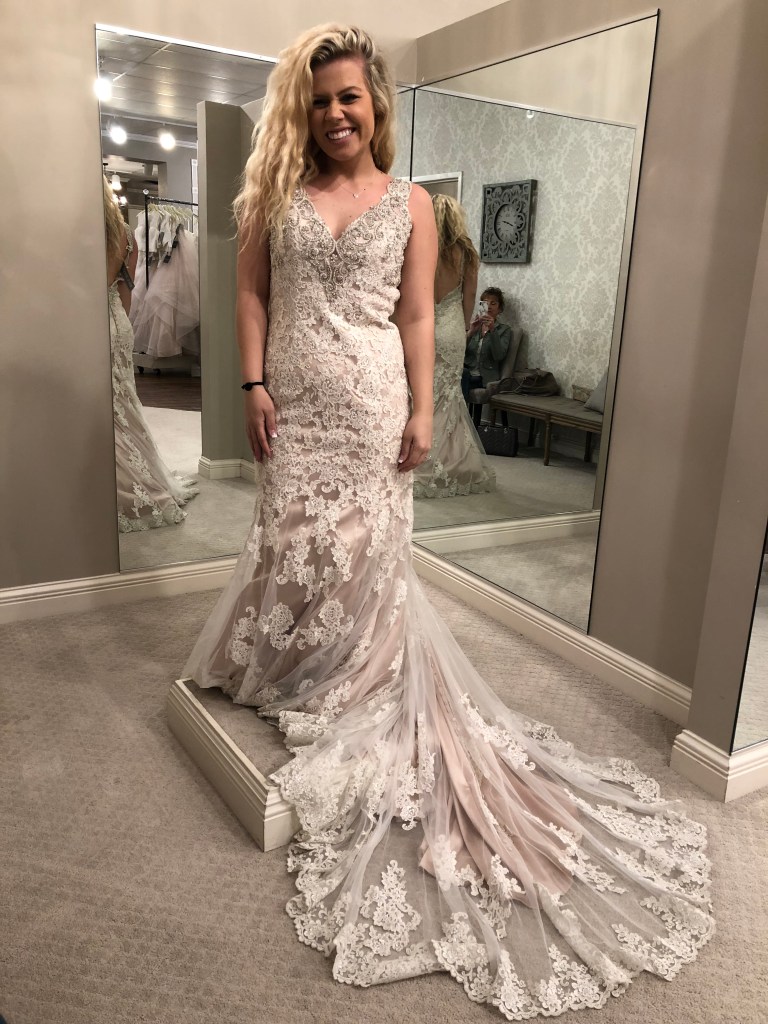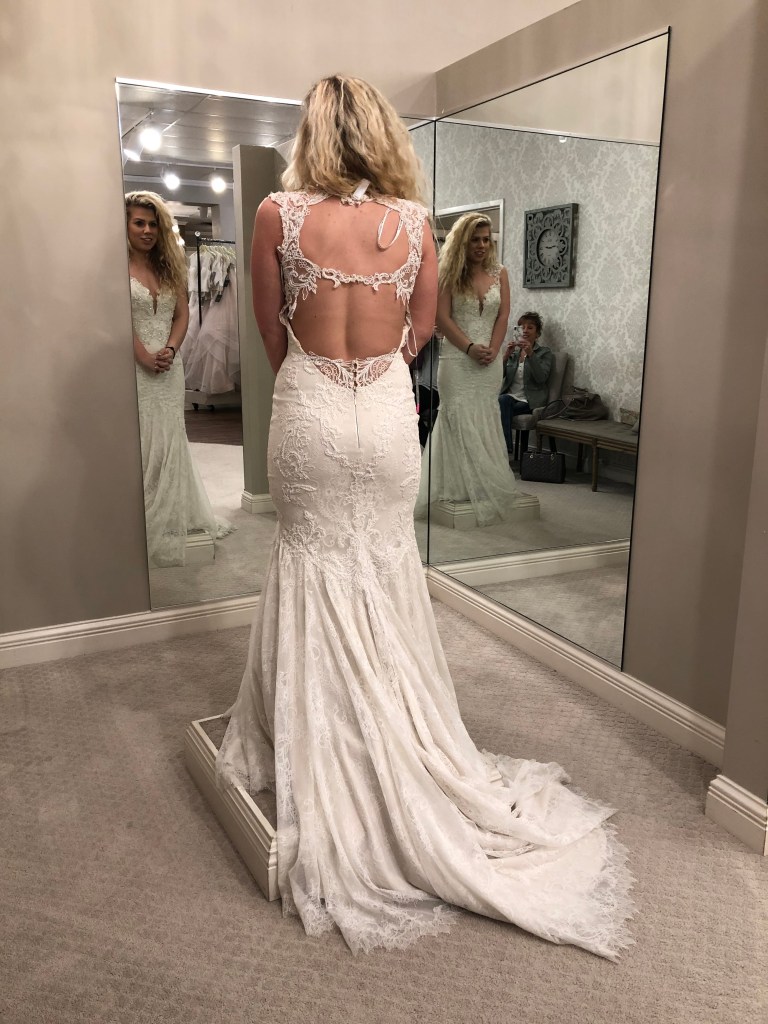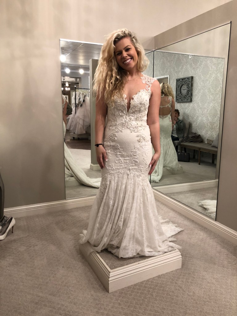in light of my wedding anniversary being last month, i came across some photos of me in wedding dresses i tried on but didn’t end up going with. i thought it would be fun to share them and a little explanation behind why i didn’t feel that was “the one.” i went in with the mindset of wanting something more form fitted that slowly loosened up towards the bottom (not mermaid though). i also wanted a low back and for it not to be strapless.