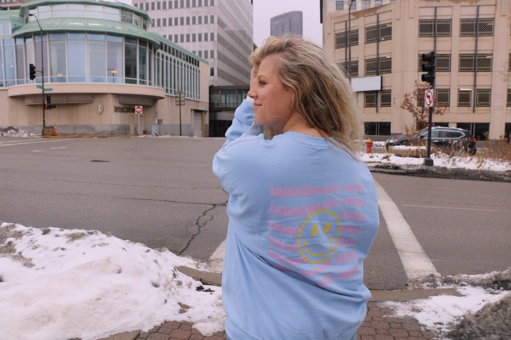 Now, let’s get to showing you the products! It’s two crewneck sweatshirts- white & light blue. The blue one is perfect for those of you who enjoy a bit of color in your wardrobe! The words are a lavender purple and the smiley face is a muted yellow! The white is for those of us who enjoy neutrals with the smiley & words in black.