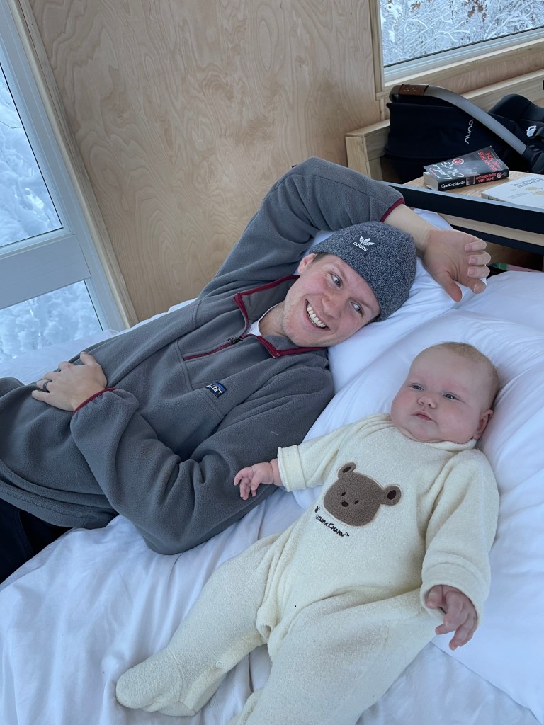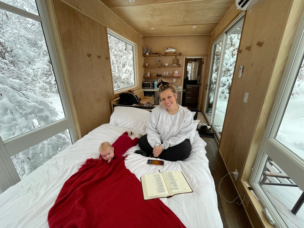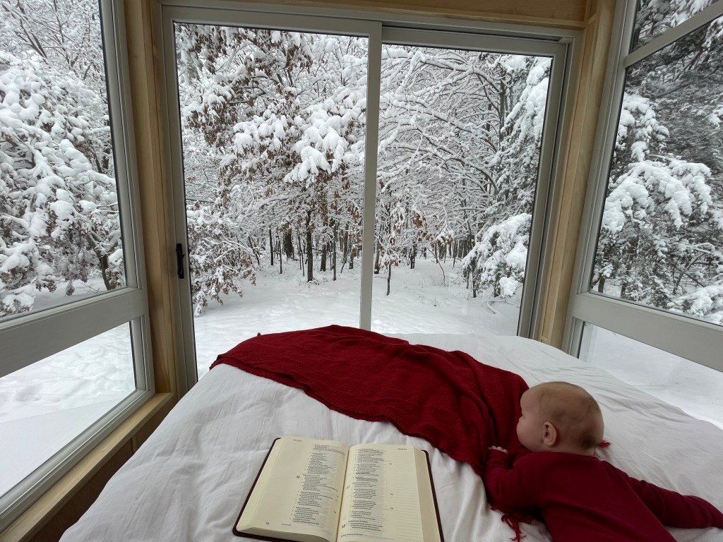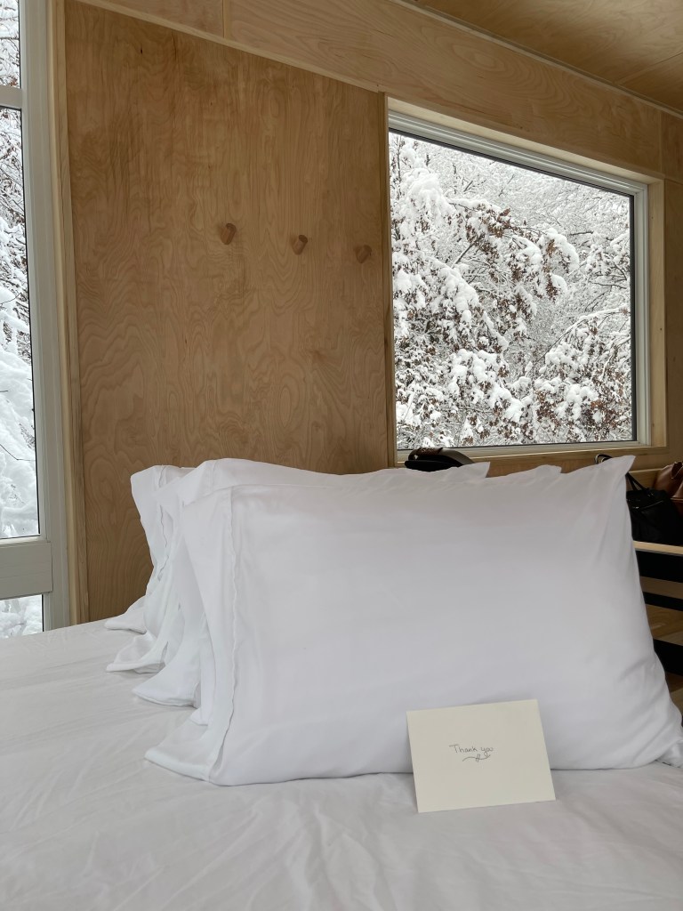 There are floor to ceiling windows that surround where you sleep. Waking up to the most beautiful snow covered trees all around is just breathtaking. We went out to eat, cozied up to new books with a fire outside, played Yahtzee while our daughter laid next to us, and enjoyed being in nature.
