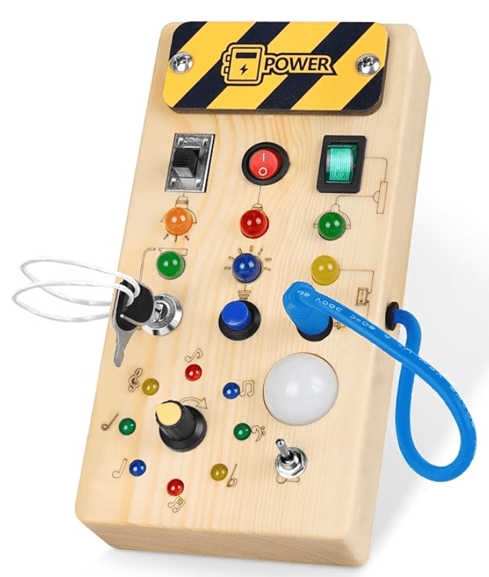 We have two versions of these & my kids are obsessed! They love pushing the buttons, turning the knobs, & see the lights come on! This is also teaching them how various kinds of switches and keys work, so that’s awesome too!