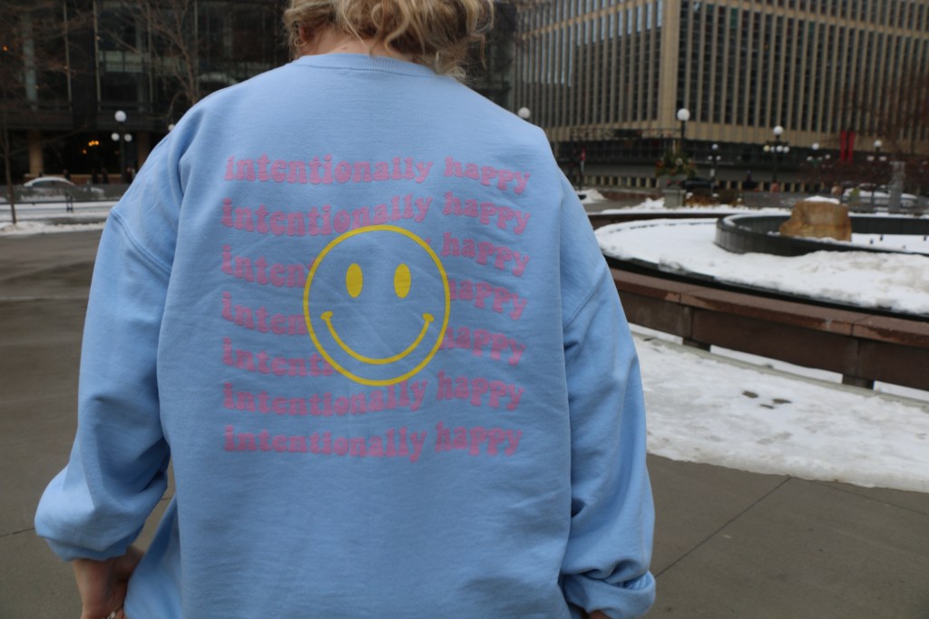White and light blue crewnecks available in adult sizing! In this world, not everything makes us happy; it takes intentionality. Think about how much better our world would be if everyone lived this way.
